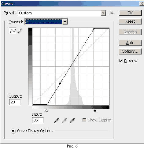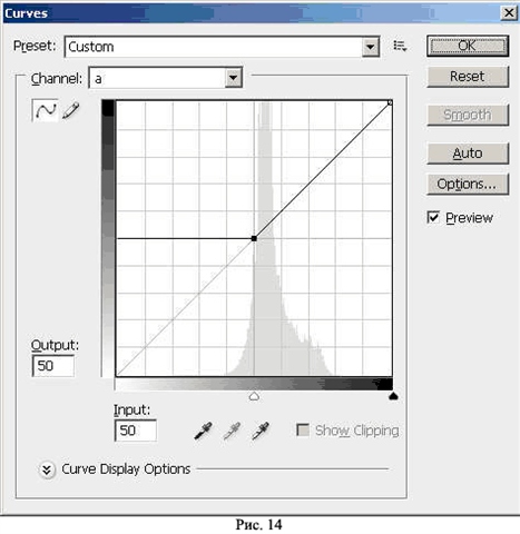Создаю корректирующий слой Curves, вхожу в кривую “a” и придаю ей вид, показанный на рисунке 14.