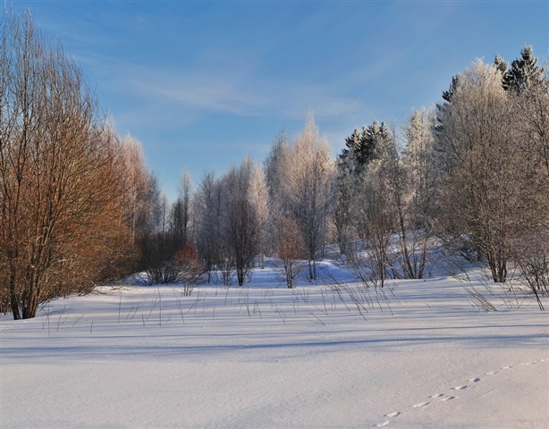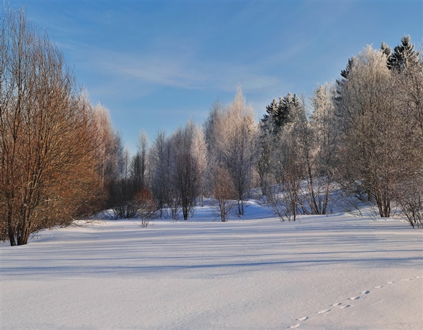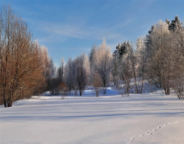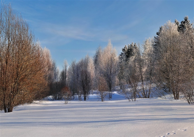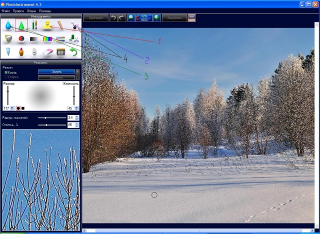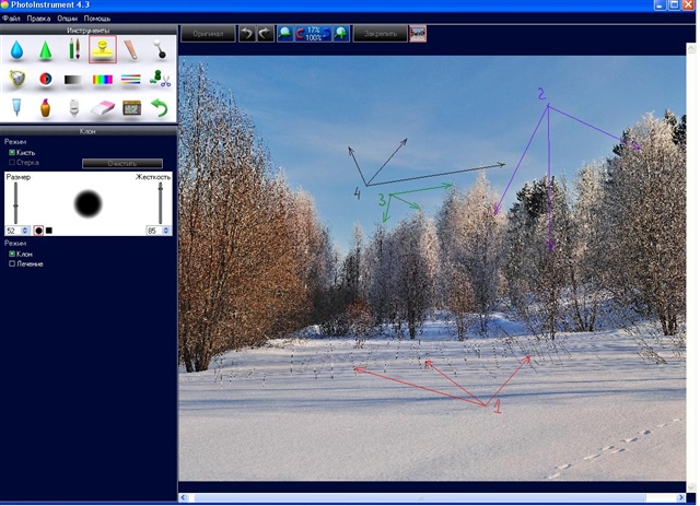 И так: Открываю программу PhotoInstrument 4.3 и загружаю свою фотографию (в первую очередь нужно определить задачи, что нужно подкорректировать на фотографии) В данном случае я вижу ,1-е. Красивые тени на снегу, но их линии перекрывают повсюду торчащие веточки, мешающие восприятию красивых теневых линий. 2-е. Очень монотонный пейзаж. 3-е. Не достаточная резкость на деревьях заднего плана. 4-е. Слабо выраженные облака и пересвеченные пятна на небе, свет на снегу второго плана. Вот этими задачами я и постараюсь заняться в дальнейшем.