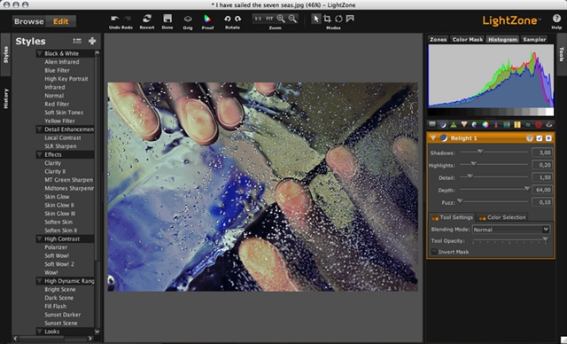 Программа располагает мощным инструментом редактирования некоторых полей метаданных, но с точки зрения организации работы с фотоархивами значительно уступает таким гигантам, как Aperture и Lightroom. Особенностью LightZone является набор "стилей" обработки: High Dynamic Range (HDR-обработка), Contrast and Pop (в стиле поп-арт), Lomo Look (ломография) и другие. Стили - не просто набор конкретных параметров. Применяя одну из предустановок, вы запускаете алгоритм автоматической обработки, который учитывает свойства исходного файла, даже когда речь идет о пакетной обработке данных. Стили можно объединять в группы (папки) и даже обмениваться ими, как Actions в Photoshop.