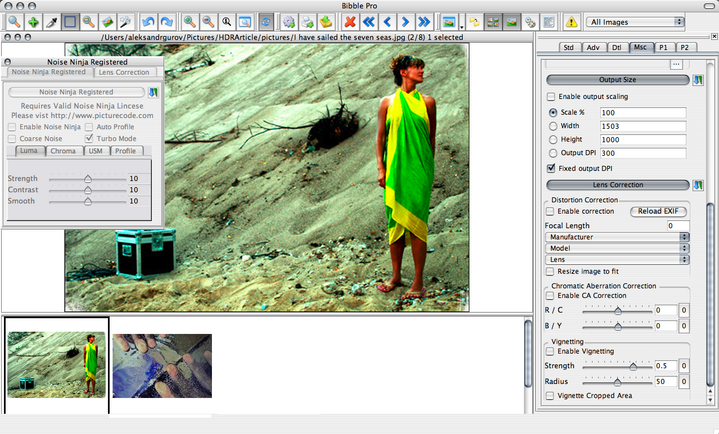 Список инструментов стандартный: кривые, резкость, экспозиция, баланс белого, вращение и кроп. Их дополняют несколько "фирменных" примочек. Для исправления оптических искажений предназначена вкладка BPTLens Correction. Bibble грамотно работает с самыми яркими и темными участками изображения, "вытягивая" максимум деталей. Для этих целей служат инструменты Hightlight Recovery и Fill Light. В состав Bibble включен лучший на сегодня фильтр борьбы с шумом Noise Ninja, а также технология оптимизации динамического диапазона Perfectly Clear компании Athentech. Кроме того, Bibble поддерживает дополнительные фильтры (например, для "художественного" преобразования цветных снимков в черно-белые). Многочисленные достоинства и великолепные результаты работы дополняет сравнительно невысокая цена лицензии - для Pro-версии всего $130.