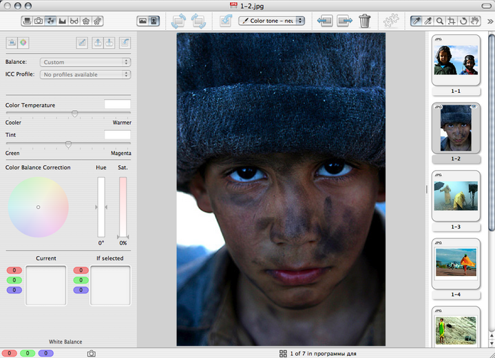 Элементы интерфейса легко убираются, освобождая пространство экрана для самих изображений. Продумана работа с несколькими файлами: можно вывести на экран два изображения с целью сравнения или работать с ними в режиме рабочего стола, передвигая и масштабируя их в пределах рабочей области. Такие настройки, как тон, насыщенность и яркость, разнесены по цветам (красный, зеленый, голубой, синий, пурпурный, желтый). Таким образом, цветовые составляющие можно подвергать выборочной коррекции. Например, усилить синюю составляющую на пейзажном снимке, подняв насыщенность неба и не затрагивая другие области.