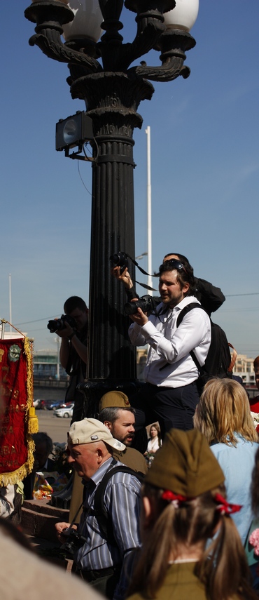 В сети куча картинок с шутками на тему, что кругом все фотографы. - В доме есть врач? - Я фотограф. - Я тоже фотограф. - И мы. Всё чаще внимание обращается на то, что в каких-то чрезвычайных или просто сложных ситуациях вместо "бежать на помощь" люди достают фототехнику или мобильные и снимают происходящее. Людоедство? Не совсем, но отражает мысль текущего времени, что каждый сам за себя, у каждого есть свой круг, а все кто вне его - не суть как важно. Но ведь в Utube миллионы людей, кто вне этого круга, но для них выкладывается видео какого-то события. И хорошо, если событие мирное, шуточное. Парадокс. Одиночество в толпе. Но для просмотра кем-то неизвестным на другой стороне океана человек готов фотографировать и снимать видео вместо того, чтобы помочь тому, кто вот здесь, рядом. Ты его не знаешь, но он, как минимум, в одной стране с тобой, в одном городе. В этом году я провёл 9 мая так, как стоило проводить прошлые, думаю. Меня пригласили в Парк Горького друзья. Они делают отличное дело. Одевшись в военные гимнастёрки, брюки ( женщины в юбки) военного времени, взяв аккордеон в руки, взяв цветы, они ходят у парка, в парке и поздравляют ветеранов, поют для них фронтовые песни. Сложно передать чувства от этого. На лицах у ветеранов эмоции меняются от напряжённой грусти до искреннего веселья, когда ребята дружно затягиваю очередную песню и выходят поплясать. Думаю, такой способ поздравления для большинства людей является самым доступным и правильным. Но там же я ощутил неловкость, стыд за то, что и на мне висят два фотоаппарата, а в рюкзаке вспышки и прочий инвентарь. Группа с аккордеоном - 7 человек ( не постоянно), в центре круга пара ветеранов. А вокруг... Кольцо из 20 или 30 "фотографов". Фиксируется каждый момент, выхватывается всякая эмоция. Ещё глубже, ещё ближе. А как сейчас сморщинится лицо художественно, какой взгляд печальный. Как иначе? Ведь потом в разделе "жанр" можно будет разместить дедушку-фронтовика со слезой, или бабушку-фронтовичку рядом с "гламурной кисой", проходящей мимо. И подпись, что-то вроде : "через много лет после войны" или "всё в прошлом", или "благодарность потомков". Да много вариантов. Но разнообразие не безгранично. Каждый год повторяется. Рядом со мной шли две женщины, возраста около 70, т.е. не фронтовички, но дети военного времени. Одна другой с раздражением сказала "...всё снимают, даже как старым людям ходить тяжело...", и другая, кивнув, согласилась. Вместе с этими ребятами ходила женщина - фотограф. И тут же печатала на фотопринтере фото ветеранов и дарила им. Им было приятно. Знаю, что многие фотограф просили координаты у ветеранов. Не знаю, как будет происходить передача снимков, но хорошо бы, чтобы произошла. И вот в тот день я почувствовал, что мне как-то неловко. Стоит снимать? Стоит! И размещать стоит, но не только бы 9 мая. Но это праздник. Поэтому, неприятно осознавать, что столько фотографий, на которых людям тяжело, на которых они испытывают разные эмоции, появляются именно в праздничные дни. Возможно, не стоит показывать в праздничные дни даже "сильные" снимки, вызывающие эмоции, если эти эмоции не праздничные?