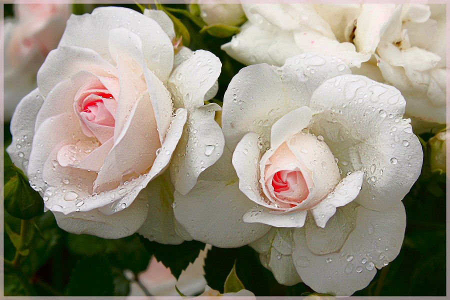 Взяв пипеткой образец монотонного серого цвета, я увеличиваю просмотр до 300% и кисточкой малого диаметра закрашиваю все границы лепестков, сохраняя капли. На всякий случай я закрасил и границу выделения. Загрузив ранее сохраненное выделение роз с инверсией, я удаляю следы своей деятельности за пределами выделения.