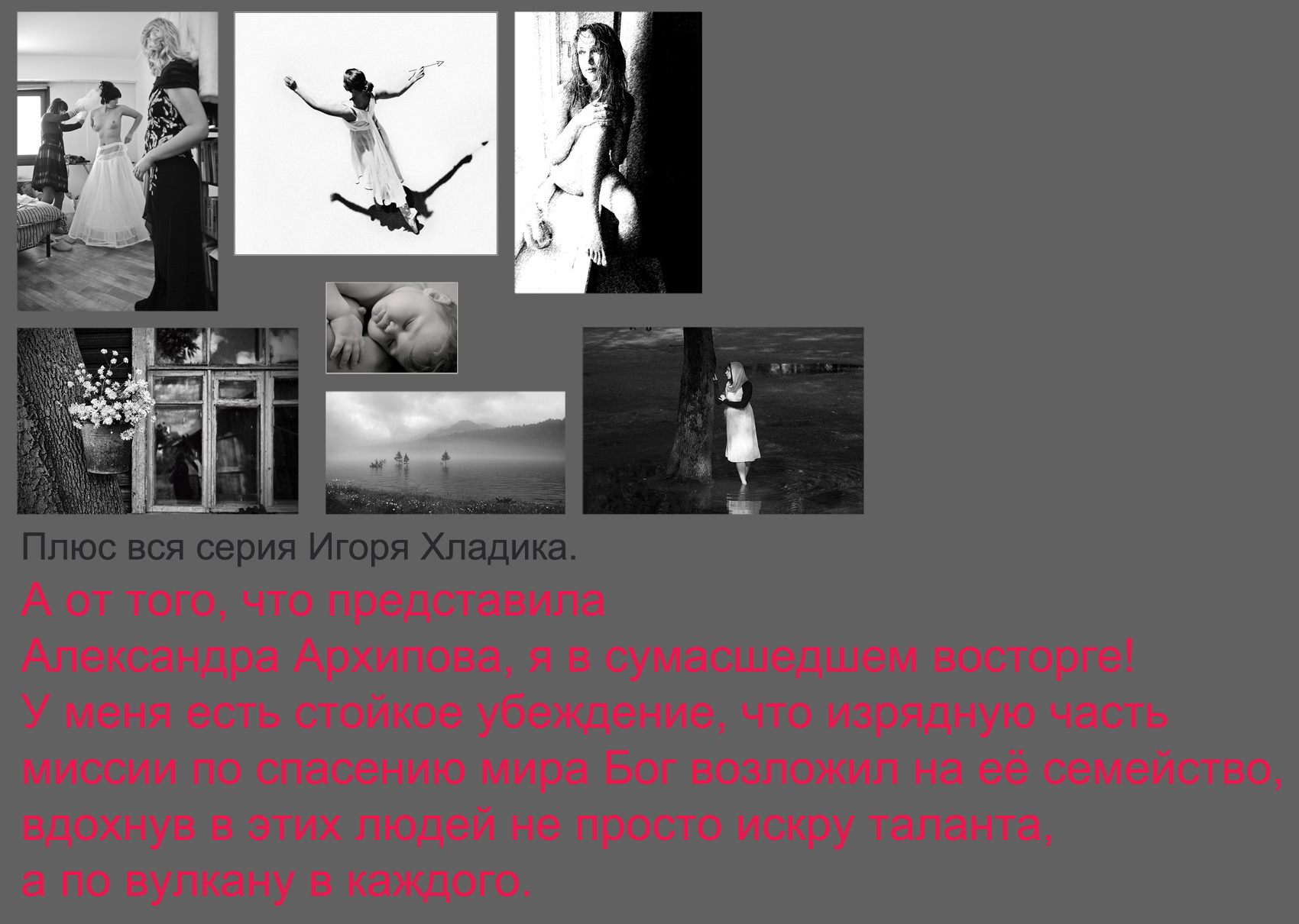 Федор Михайлович, вложив в уста своего героя слова - Красота спасет мир- имел в виду духовную красоту, красоту души...Тема ФМ довольно-таки сложная, неоднозначная...Увы...все эти женские тела к раскрытию темы никакого отношения не имеют (хотя и красиво!) Серия Анны Руфф о семье и материнстве ближе всех к заданной теме... | |