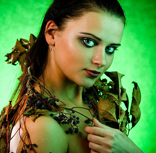 Зеленая гамма это неуверенность, разочарование. Пожухлые листья и дикие ягоды, увивающие модель, старят ее. С другой стороны юный возраст модели и задорная улыбка. В чем замысел? Заботься о пенсии с молодости?