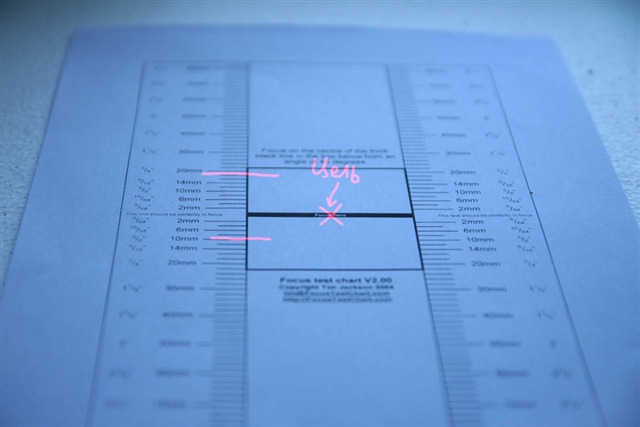 Цель находится в плоскости самой линейки. Ось объектива не перепендикулярна линии цели. Фокусировка не по центральному датчику. Разве так должно быть при тестировании? | |