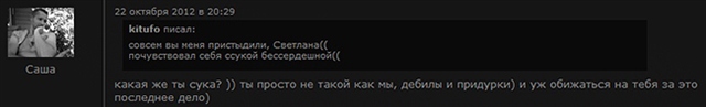 первый раз кефир оскорбил Бри в ветке Дмитрия которую Дмитрий и снес, я тогда еще за Аню вступился супротив Валерия Яблокова, моя реакция на это было следующим же комментом на той же странице, Аня еще меня стала провоцировать, мол, а что ты Александр сделаешь в виртуале, долго так и настойчиво допытывалась ...