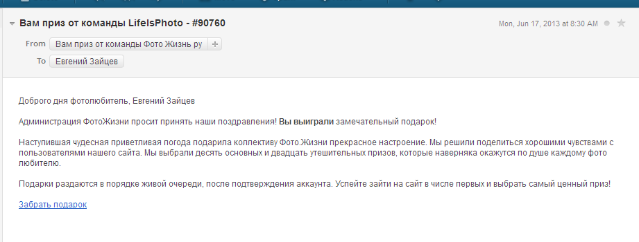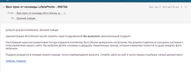 Никогда не вестись на то ,что Вы выиграли приз ,не учавствуя в розыгрыше его ...это не про нас .Я понимаю ,что многие вещи часто проходят на шару,но ни в этом случае......Ну и почтовый ящик с которого приходят письма . Обычно ящики называют более менее продуманными именами ,что б запоминалось ,также и ссылки в основном ,но если это какая то абракадабра типа AdminJkruyE@mail.ru или что то в этом роде,то уже должно напрячь... Тем более ящики мошейников всегда разные в нашем случае по Фотожизни .Запомните примерный маил извещения фотожизни о пришедшем сейчас ответе на Ваш коментарий ,сличите и увидите разницу.... | |