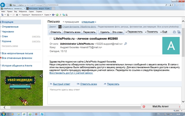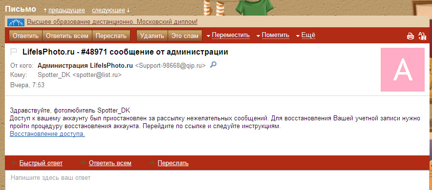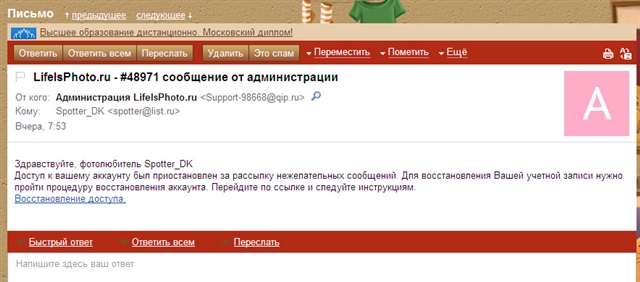 _________________________________________ Фото.Жизнь.ру - Вам новое сообщение #31206Сегодня, 14:36 Приветствуем Вас, фотолюбитель портала Фото.Жизнь Tatyana Shupikova. Наши системные администраторы обнаружили попытку рассылки нежелательныхсообщений с вашей учетной записи. В связи с этим нам пришлосьприостановить доступ к вашей учетной записи. Для разблокировки доступа каккаунту, Вам нужно осуществить процедуру восстановления учетнойзаписи.Перейдите на сайт по ссылке и следуйте инструкциям. Восстановить доступ. Быстрый ответ Ответить всем Переслать ________________________________________ я имею аккаунт на ФотоЖизни, но очень давно не заходила на сайт. Когда пришло первое такое письмо, подумала мало ли что - ни на какие подозрительные и неизвестные ссылки не захожу, по этому пошла прямиком на ФотоЖизнь, увидела, что доступ есть - поняла, что это чьи-то проделки! вот и на форуме нашла, что не мне одной шлют эти письмена и решила поделиться. | |