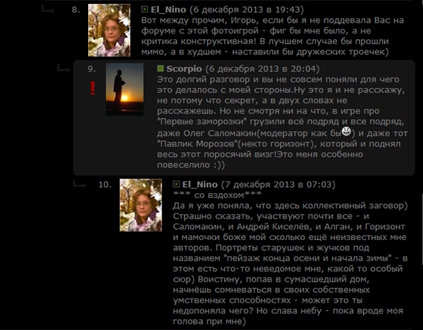 Для полноты картины можно добавить: http://www.lifeisphoto.ru/photo.aspx?id=1525413&repostid=0&commid=11686690 _ _ _ Конечно, у самого Г-на Scorpio, все работы в этой игре полностью соответствуютзаявленной теме. ))) _ Кстати, Нина. Насчет портретовОлега и Дмитрия, очень даже подходят, если тему раскрывать шире. Это как в работе про паука и что она делает в игре «Городокпровинциальный». Для большинства это, конечно не понятно, но для тех кто «играет»в эту игру и в курсе всех хитросплетений, топоследовательность, названия, да и сами сюжеты, отнюдь не случайны. _ Нина, Вы говорите заговор, как бы там не было, но Г-н Scorpio уже перестал размещатьвсе свои работы на главную в раздел «ФотоИгра»-это раз. Более тщательно стал относиться к завалам и искривлениям-это два. Меньше стало брака при использовании фотошопа и вчастности при использовании инструмента клонирования и добавления обьектов- этотри. _ Возвращаясь к пауку «Рожденный ползать …» и «…и даже тот "Павлик Морозов"(некто горизонт),который и поднял весь этот поросячий визг!» Есть такое понятие: Комплекс провинциала по Сергею Москалёву «Комплекс провинциала - состояние, когда талантливыйчеловек приезжает из провинции, то есть из того места, где он был на головувыше всех, в центр или в другую страну. Из-за этого он часто неправильноградуирует свой уровень. Смотрит на окружающих сверху вниз, он привык бытьпервым. При этом такой человек часто теряет возможность учиться и попадает вситуацию, когда ему надо постоянно доказывать свою привычную крутизну. Дляэтого он может окружить себя всякого рода посредственностями, раздавая своим«друзьям» клички типа «Помидор», «Огурец», а себя при этом называя «Маэстро»или «Одинокий волк»… Москалёв С., Словарь эзотерического сленга, М., «Гаятри»,2008 г., с. 88-89. Только не надо цепляться к словам талантливый ипосредственности, вполне понятно, о чем идет речь. _ P.S. Есть еще один пункт,который тоже бросается в глаза (к тем трем выше по тексту), но об это чутьпозже. _ "....а, зачем тебе голова? Я ей ем." Приятного всем дня. | |