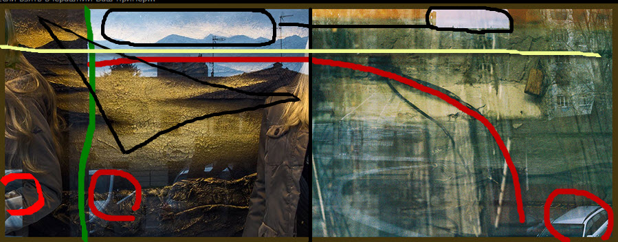 Какие я вижу здесь совпадения? 1.Они близки по цветовой гамме. 2.Кажется оба с отражениями или с наложениями.А может один с отражением,а второй с наложением...но это почти одно и то же. 3.Здание с окнами и там и там 4.Белая машина. 5.Световое пятно-квадратный кусочек неба вверху и там и там. 6.Совпадают,кажется,по жанру (психоделический) 7.Самая интересная зацепка:на втором снимке черная штука,что в центре кадра... расположена так,как будто очерчивает линию по плечу и руке человека как бы продолжая этим форму тела девушки на первом снимке справа.Визуально кажется ,что часть ее тела находится на первом снимке,а остальная часть- на втором...правда немного в искаженном варианте и выглядит чуть большей,чем должна была бы быть на самом деле.Но это не суть.Суть в том,что очертания тела девушки начинаются на одном снимке,а продолжаются на втором. Какие несовпадения? 1.На первой присутствует человек и пейзаж...на втором этого нет. 2.На втором присутствуют бытовые приборы...на первом нет.